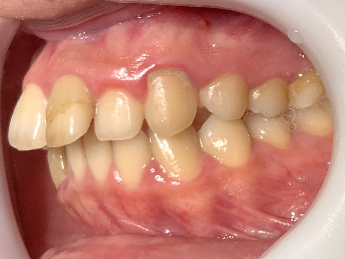 左上前歯が折れておりその歯の治療を希望されて来院されました。 過去に転倒した際に破折し、歯科医院を受診しており破折した歯は接着剤で固定し、根管治療を受けていらっしゃいました。 当院受診時には当該歯に根尖病変を認めたため根管治療からやり直す必要がありました。患者様と相談し根管治療は保険、補綴は自費で治療することとなりました。全顎的な歯周病の治療も並行して行いました。 前歯なので審美を優先してオールセラミッククラウンでの補綴を行いました。