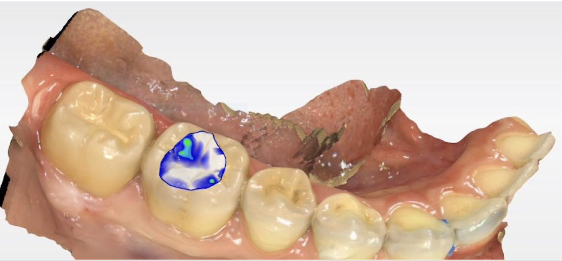 右下奥歯の虫歯治療を主訴に来院されました。はっきりとした症状はないが違和感を感じる気がするとのことでした。 下顎右側大臼歯2本は過去にコンポジットレジン修復治療を受けており、劣化を認めました。 患者様は1回の来院で修復処置を全て終えたいとの希望だったのでセレックを用いたワンデートリートメントを行うこととしました。 第二大臼歯は窩洞が小さいので型取りをせずにその場でダイレクトボンディングを行い、第一大臼歯は窩洞が大きく神経まで近接していたため一部コンポジットレジンという材料で保護した上でセレックでスキャンし即日でのセラミック修復処置を行いました。