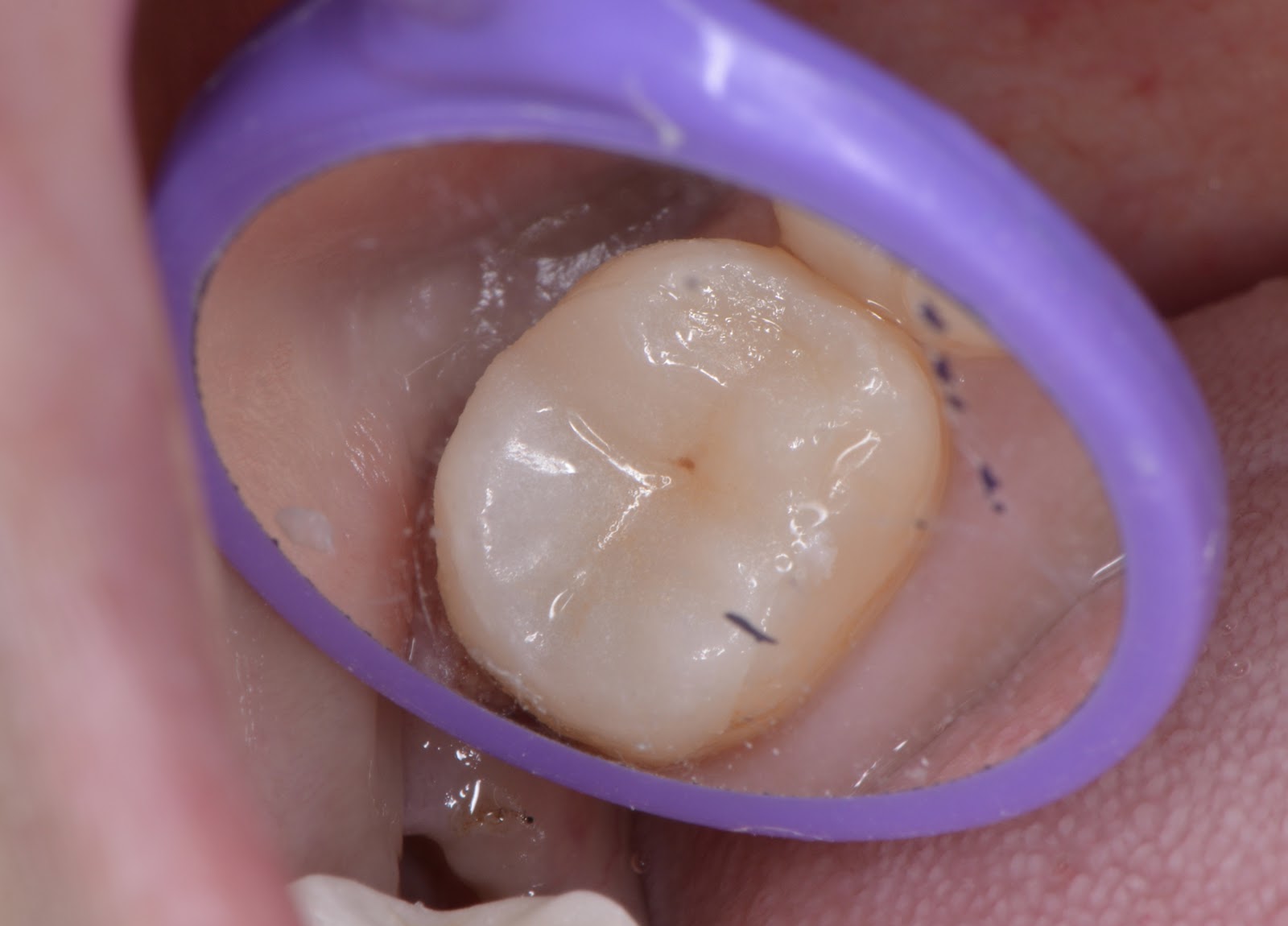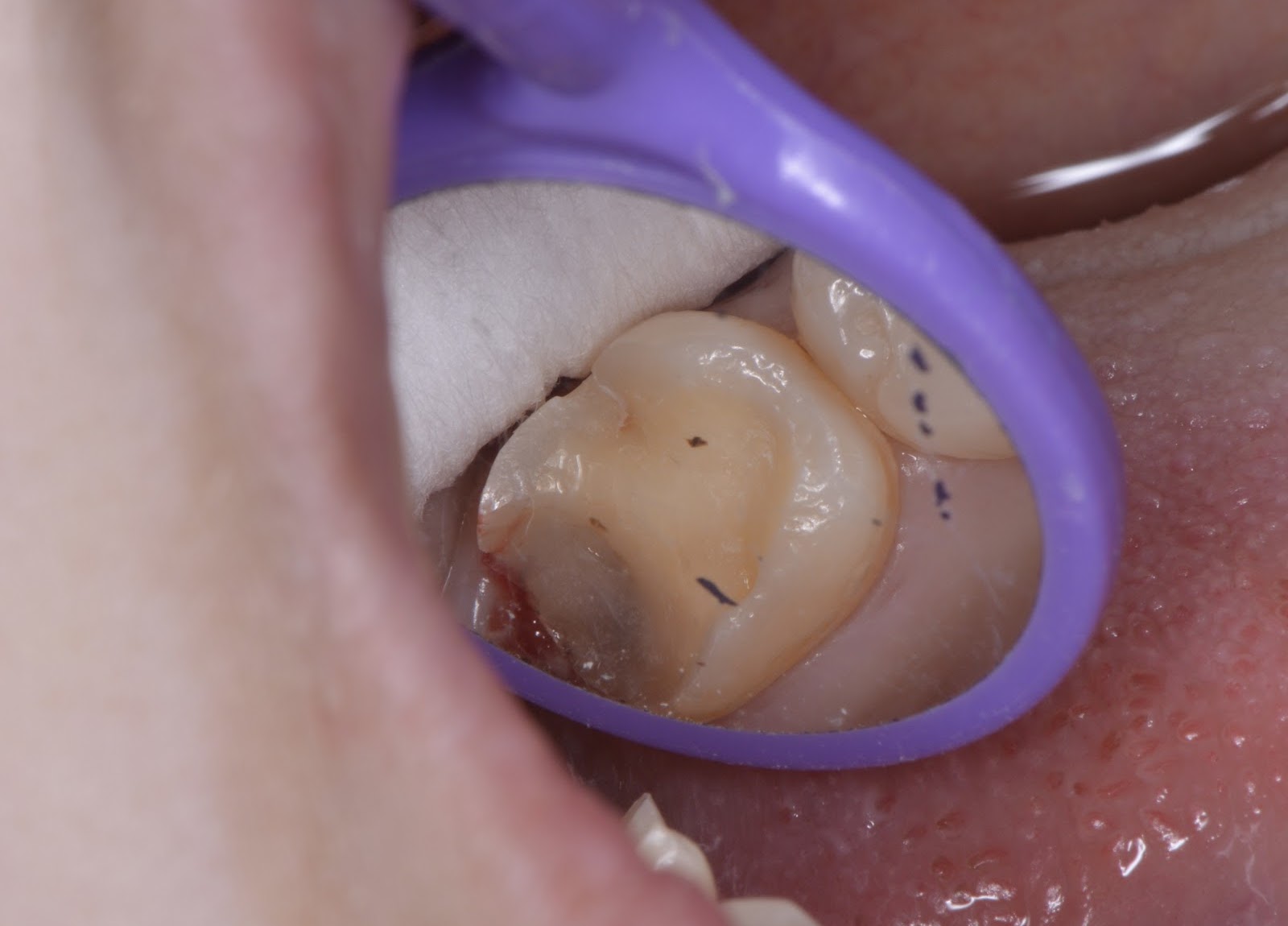 右下の奥歯は親知らずが傾いて生えてきたことにより虫歯になり、内部で広がっていました。幸い神経までは達していませんでしたので部分修復治療で終えることができました。なお虫歯治療を行うに先立ち親知らずの抜歯を行いました。
