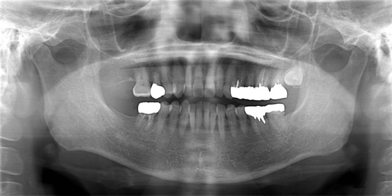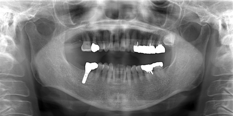 右下の一番奥の歯が痛むということで来院されました。右下は歯が割れており(歯根破折)、抜歯してインプラント治療を行いました。 CT所見から骨が比較的あったので、歯を抜くと同日にインプラント埋入オペを行いました。