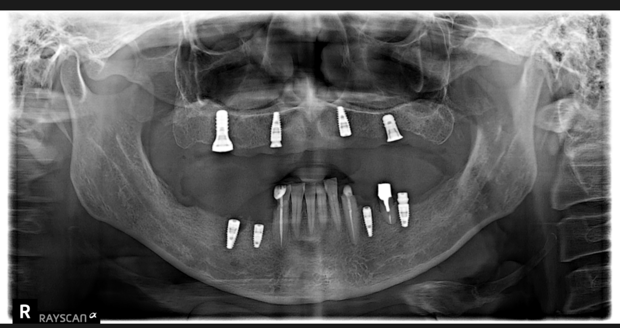 術前術後のレントゲン写真です。 上下とも、インプラントを埋入しました。上の顎のインプラントはロケーターという装置を用いております。臼歯部のインプラントはティッシュレベルインプラント、前歯分のインプラントはボーンレベルインプラントを採用しております。適切な種類のインプラントを選択することにより、術後の歯周組織の安定や、インプラント治療の長持ちを実現できます。