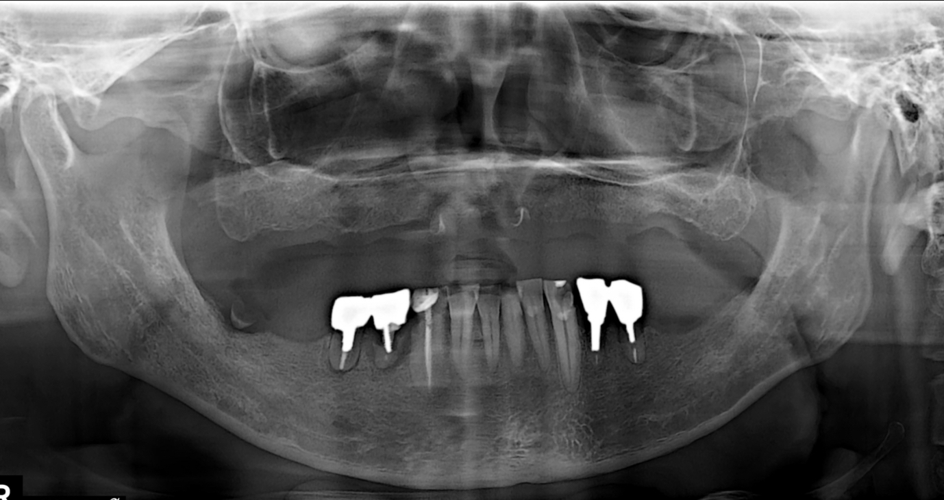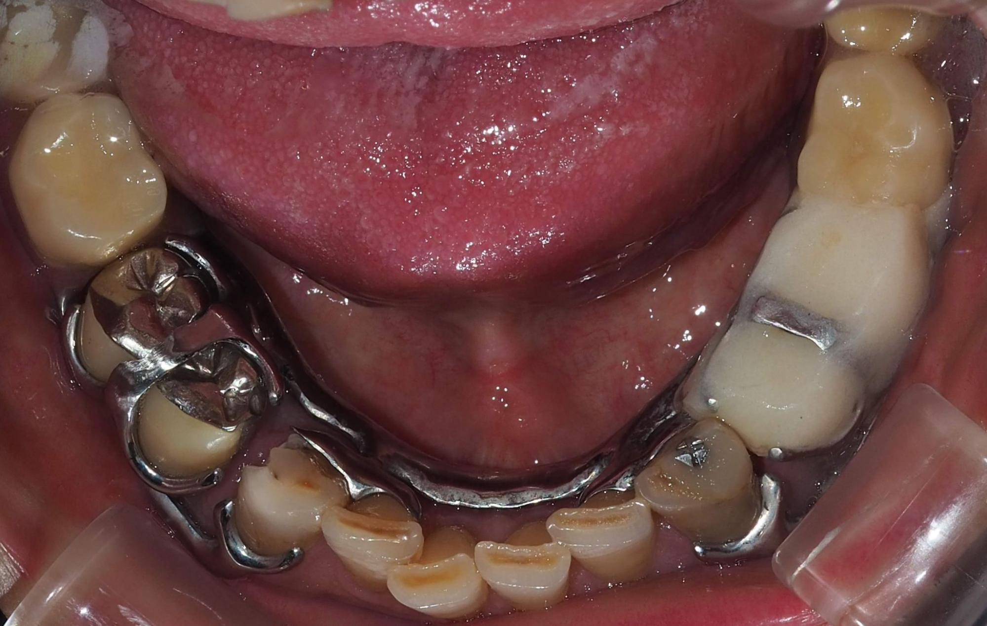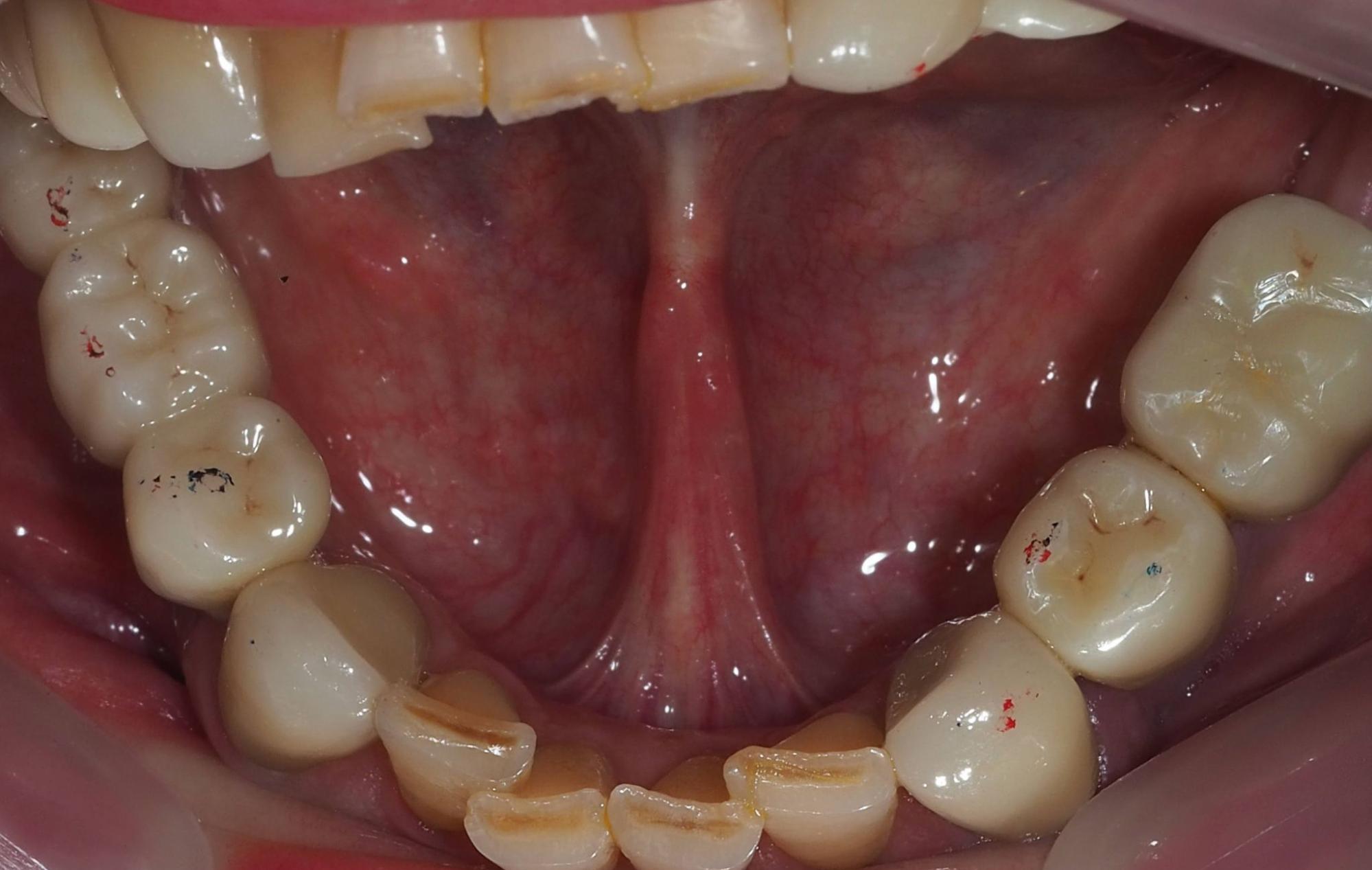 下の歯には部分入れ歯、上の歯にはもともと総入れ歯が入っていましたが、人工の歯のすり減りやかたつきを認めました。患者様はできるだけ美味しくごはんを食べられる形をご希望されたため、インプラントを用いた治療を行うこととしました。下の歯は、インプラント4本で安定する形を実現できたため、取り外しをしなくてよい固定式、上の歯は歯がない本数が多すぎるため、予算の関係でインプラントオーバーデンチャーで治療することとしました。